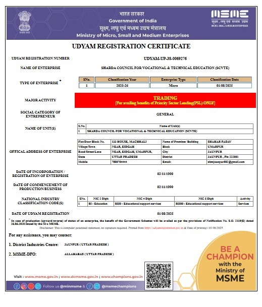 | 20. | MSME SCVTE | UDYAM-UP-38-0069276 | Document |